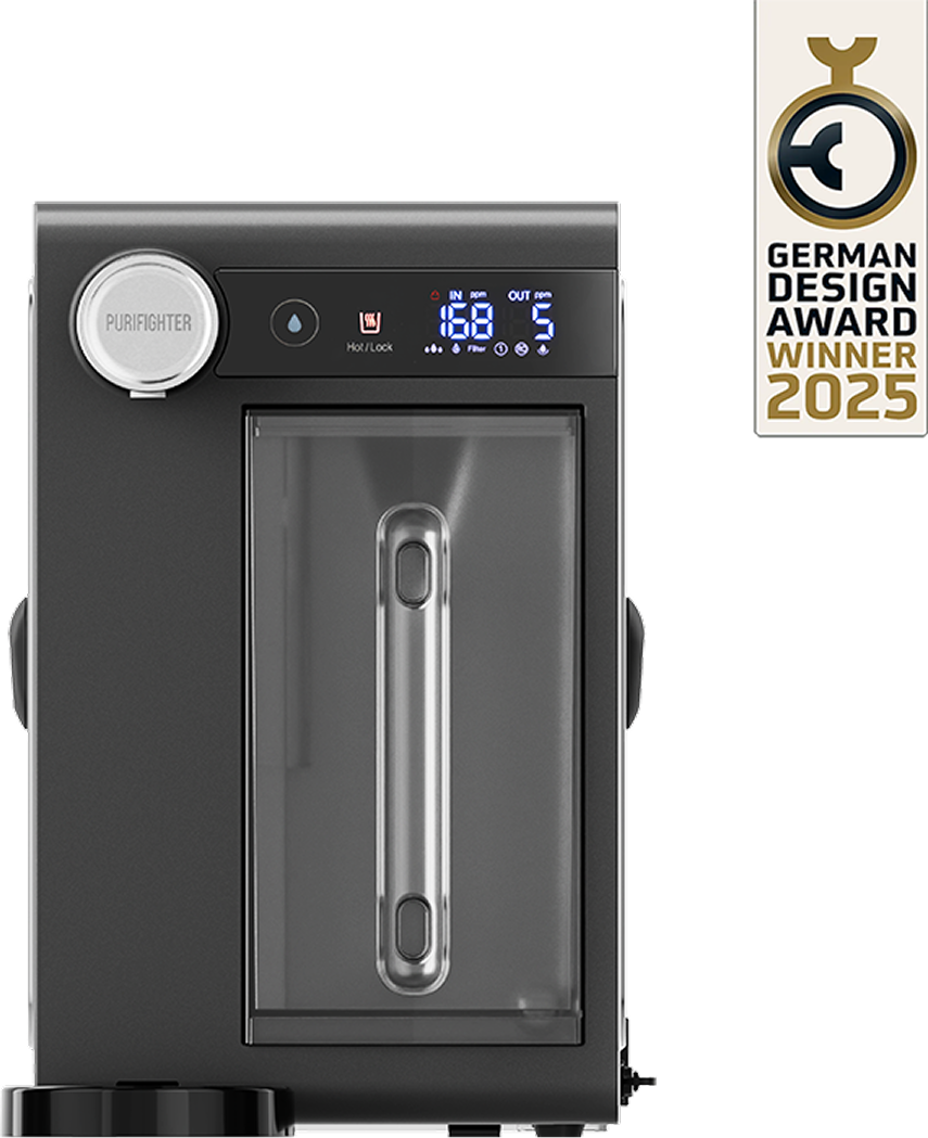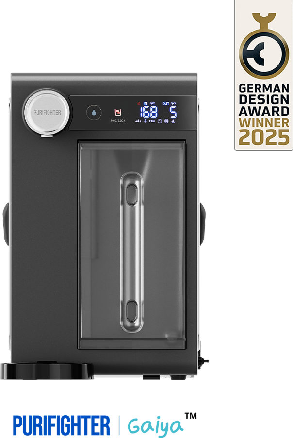 Purifighter Gaiya™ Countertop Water Purifier uses a multi-stage reverse osmosis filtration system to remove contaminants and improve water quality. It effectively reduces Total Dissolved Solids (TDS), chemicals, and impurities, delivering clean, purified water.