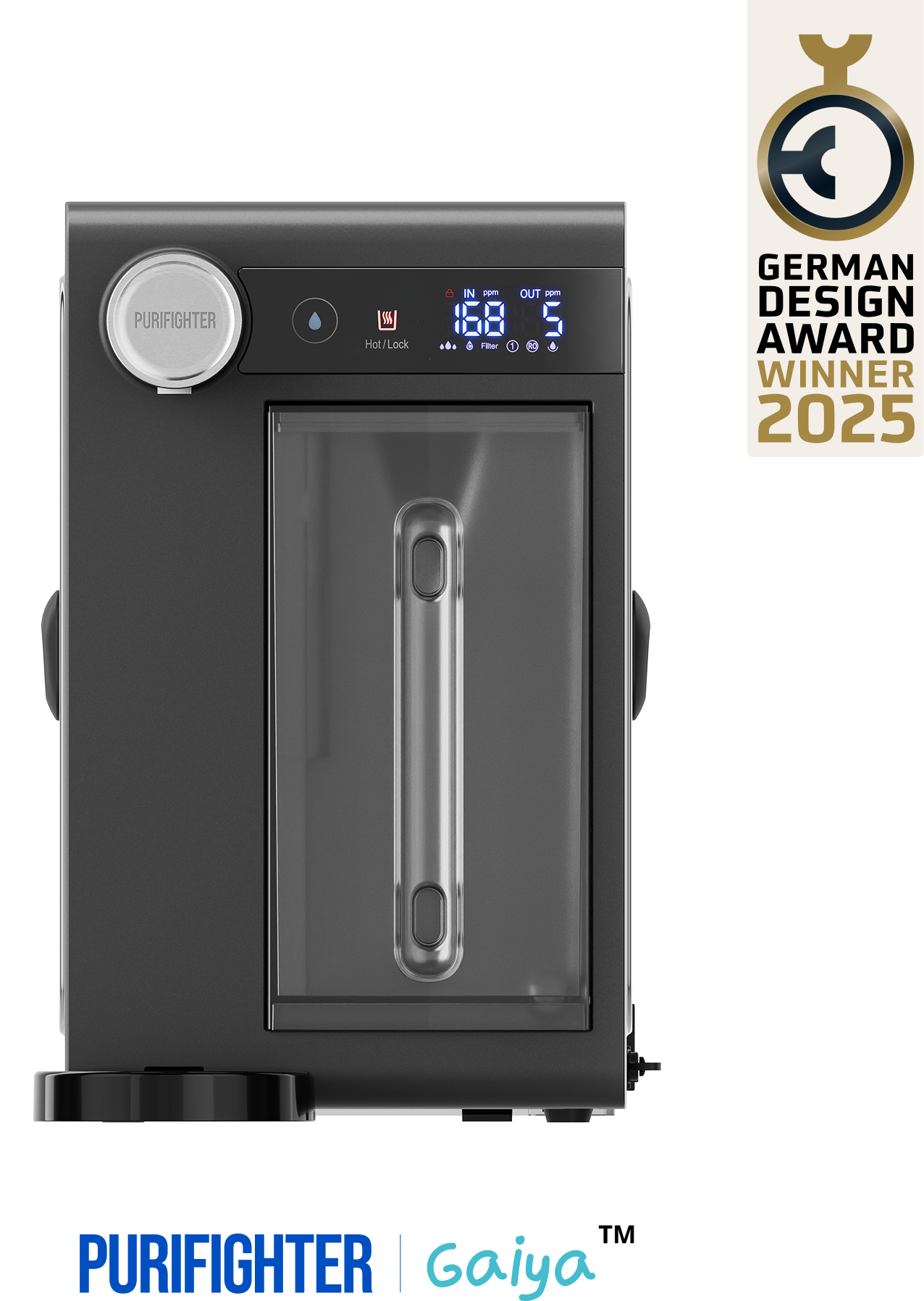 Purifighter Gaiya™ Countertop Water Purifier uses a multi-stage reverse osmosis filtration system to remove contaminants and improve water quality. It effectively reduces Total Dissolved Solids (TDS), chemicals, and impurities, delivering clean, purified water.